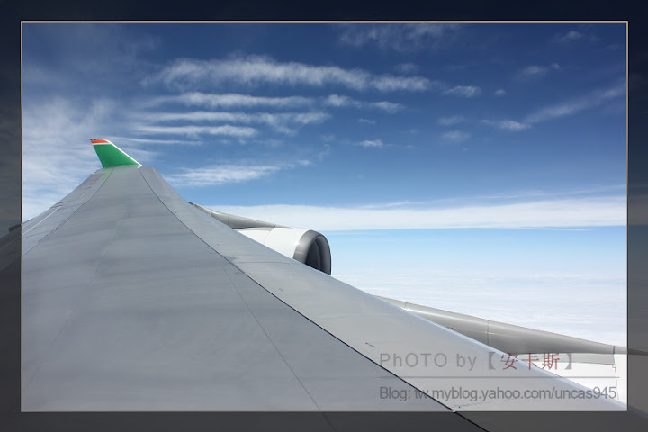 我們的座位剛好靠窗,所以看得到機翼及美麗的天空。