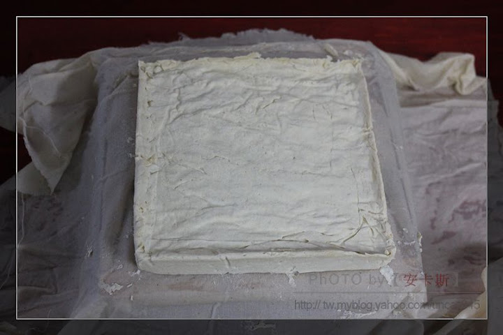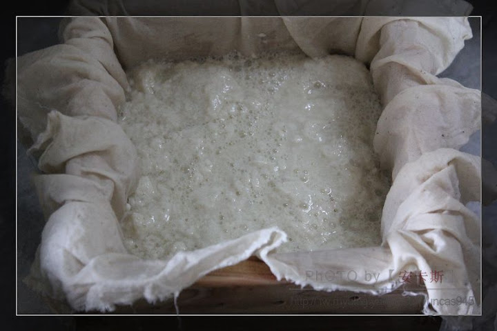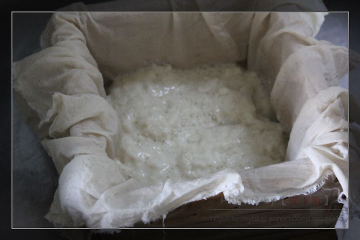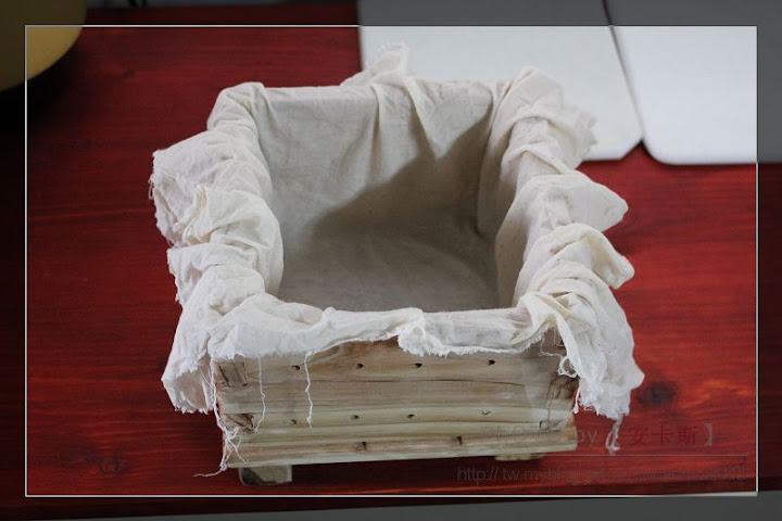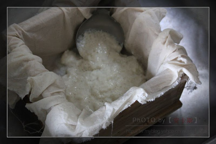然後將豆腐花一一舀進豆腐模,均勻鋪於每ㄧ角落