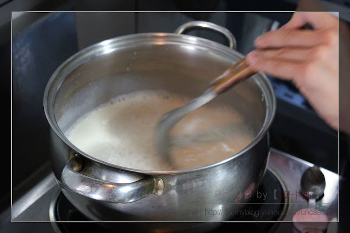 然後靜待豆漿冷卻至80度C後,接著倒入由90CC水+1.8g鹽滷所調成的鹽滷水,